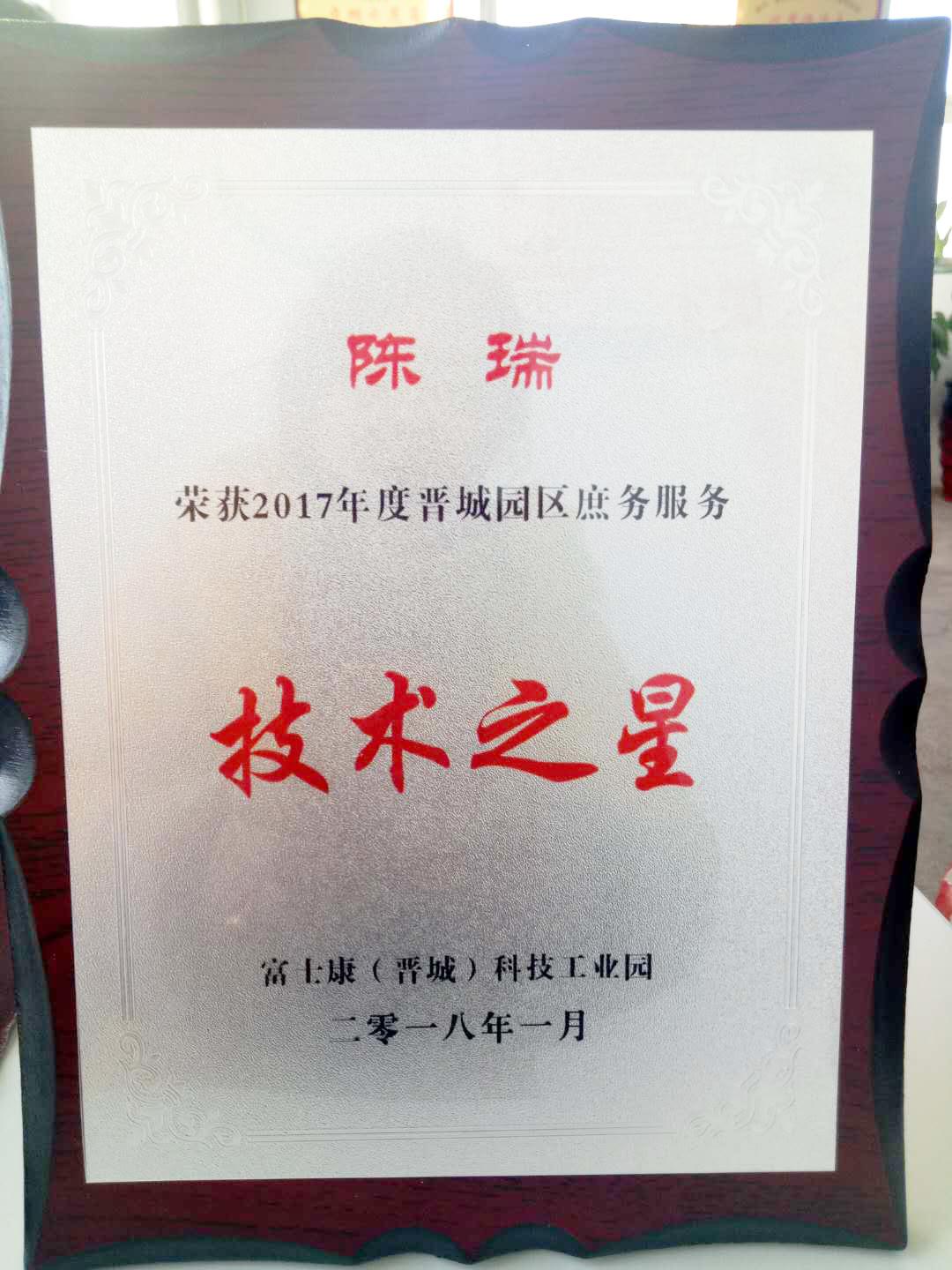 近日,在富士康(晉城)科技工業(yè)園舉辦的2017年度晉城園區(qū)庶務(wù)服務(wù)年終評(píng)比中,我公司員工陳瑞榮獲“技術(shù)之星“的稱號(hào),這份榮譽(yù)是陳瑞總結(jié)日常工作所得經(jīng)驗(yàn)再加上自身的刻苦鉆研,勤勞肯干的精神取得的。