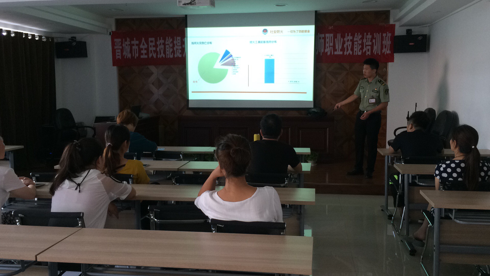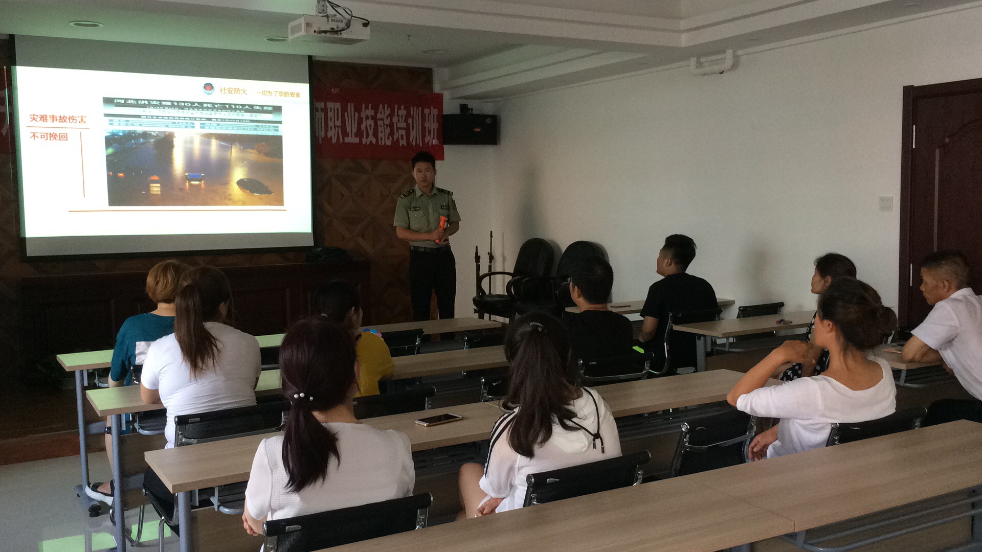 1、課堂上,教官通過強烈震撼的火災(zāi)圖片和視頻以及生動的案例,讓員工詳細了解了火災(zāi)的危害。