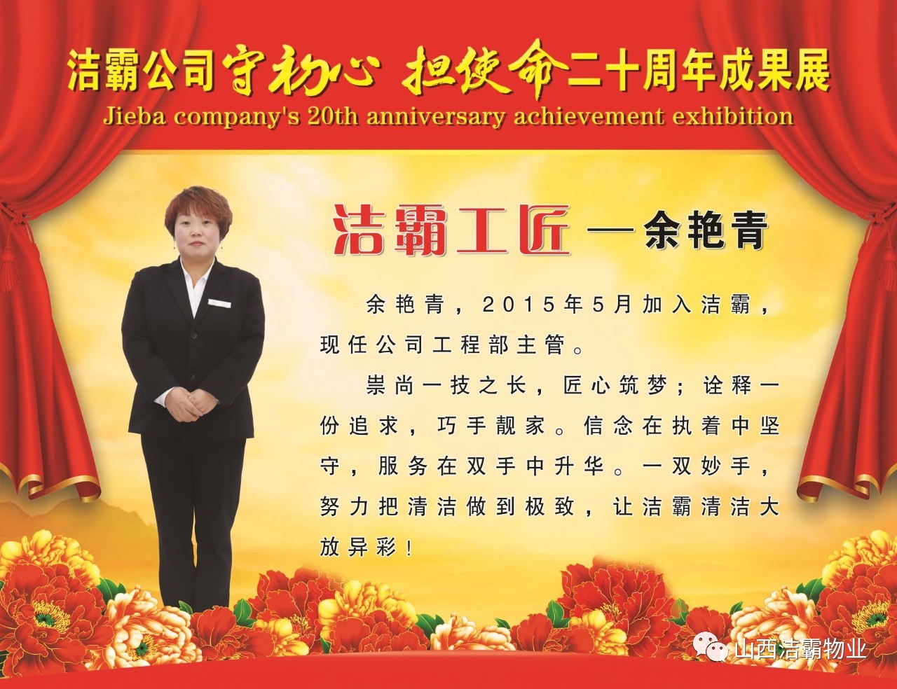 本次晚會以“潔霸二十華彰,感恩共創(chuàng)輝煌”為主題,此次慶典的核心思想是“感恩”,主要角色是潔霸的創(chuàng)業(yè)者。為此,公司對入職潔霸的創(chuàng)業(yè)功勛和一線員工進行了表彰獎勵。本次晚會共設(shè)8個獎項,包括“潔霸先鋒”“奉獻之星”“管理之星”“潔霸管家”“潔霸工匠”“清潔之星”“潔霸衛(wèi)士”“園藝之星”等。他們是:李山虎、張永智、史志霞、陳福林、王紅軍、余艷青、劉二丑、成艷粉、楊改梅、王書玲、張國榮、耿竹青、張粉霞、宋秋苗、陳先梅、張晉平、張偉山、趙瑞軍、王廣平、郭志云。晉城市原副市長成育廷、晉城市商務(wù)局原局長王新善、晉城市非公和社會組織工委書記郎軍芳、晉城市婦聯(lián)三級調(diào)研員李蓮菊、晉城市總工會商貿(mào)輕紡煙草服務(wù)業(yè)工會主席張玉濤、晉城市城區(qū)財政局局長翟明太等領(lǐng)導為他們頒獎。