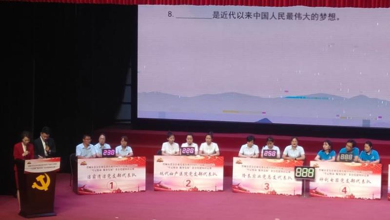 不忘初心跟黨走,牢記使命譜華章!為了慶祝中國共產(chǎn)黨成立99周年,6月28日下午,晉城市非公企業(yè)黨委在澤州天泰錦辰煤業(yè)有限公司職工文化宮進行了一場別開生面的“牢記使命 服務發(fā)展”黨建知識競賽。潔霸清潔黨支部、現(xiàn)代婦產(chǎn)醫(yī)院黨支部、隆泰實業(yè)黨總支、神利電器黨支部、眾宸工貿(mào)黨支部和蔬菜公司黨支部等六支代表隊在此激戰(zhàn)正酣,各代表隊你追我趕,斗志昂揚,不甘落后,力爭上游,最終,我公司支部代表隊榮獲比賽三等獎。