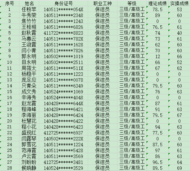 晉城市潔霸清潔服務(wù)股份有限公司職業(yè)技能等級(jí)認(rèn)定中心2024年5月19日第16批保潔員高級(jí)認(rèn)定人員成績(jī)公示