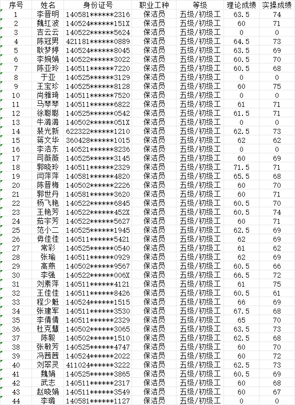 晉城市潔霸清潔服務(wù)股份有限公司職業(yè)技能等級(jí)認(rèn)定中心現(xiàn)將2024年7月21日認(rèn)定人員成績(jī)公示如下: