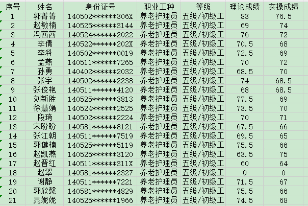 2024年9月1日第35批養(yǎng)老護理員初級認定人員成績公示